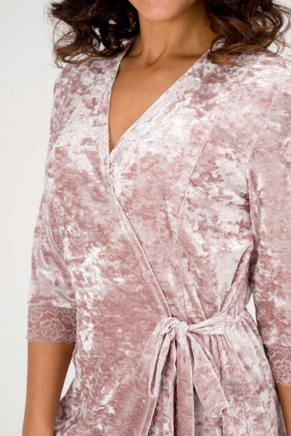 Шикарный домашний халат на запах из бархата, рукав 3/4 декорирован кружевом. Нежная и приятная ткань в потрясающем цвете — идеальный подарок для себя или близкой подруги. Халат подходит под любой тип фигуры благодаря идеальным лекалам и широкому размерному ряду, есть и большие размеры. В этом шикарном халате приятно не только окунуться в мир спокойствия и домашнего уюта, он идеально подойдет для встречи гостей. При этом вы всегда будете выглядеть элегантно и привлекательно! Бренд «Serenada» — всегда качественная одежда для женщин. Сделано в России на собственном производстве.