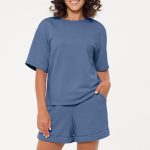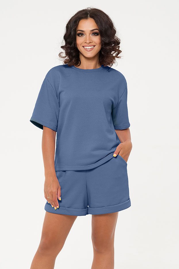 Костюм- футболка с шортами свободного силуэта из хлопкового футера 3-х нитки. Футболка свободная со спущенным рукавом. Свободные шорты с боковыми карманами, притачной пояс с резинкой. Костюм подойдет для летнего активного отдыха и для прогулок к морю.