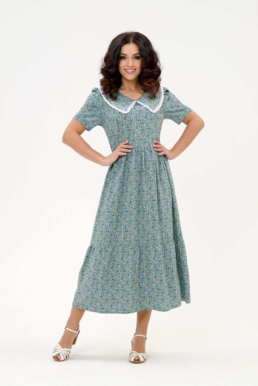 Летнее женское платье из штапельной ткани нежной цветочной расцветки.