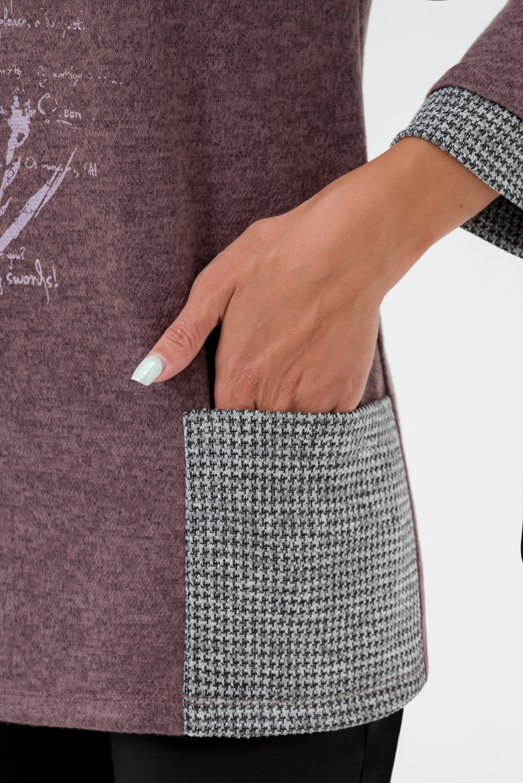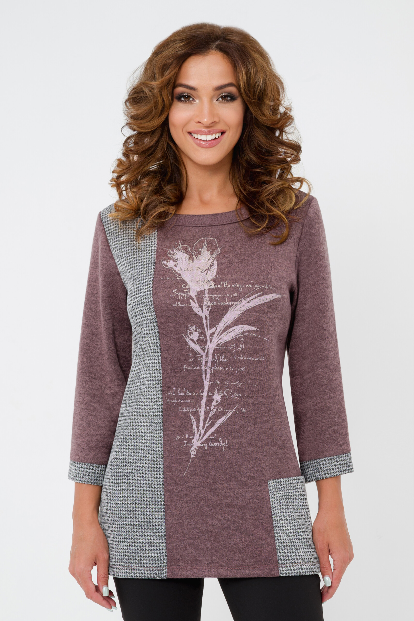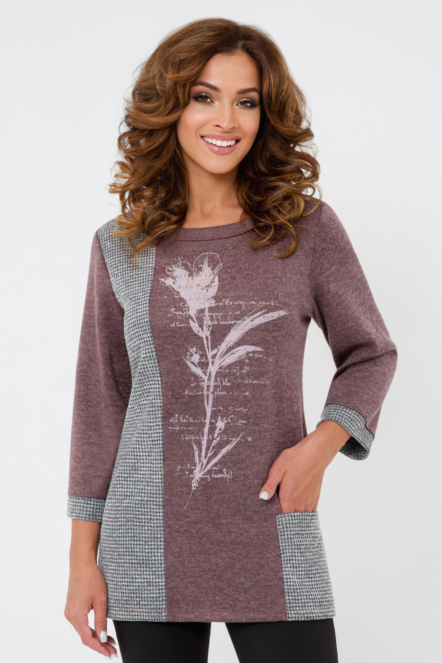 Мягкая и теплая туника прямого силуэта комбинированная из двух тканей.В центральной части цветочный принт. Рукав три четверти, манжеты из отделочной ткани.Туника может стать украшением вашего гардероба.