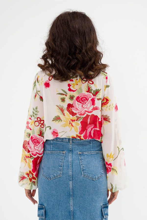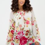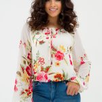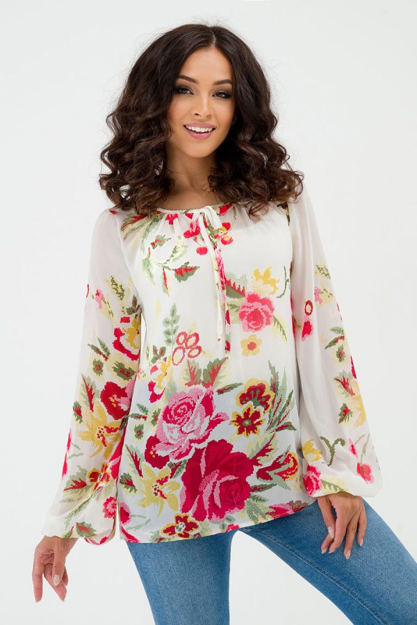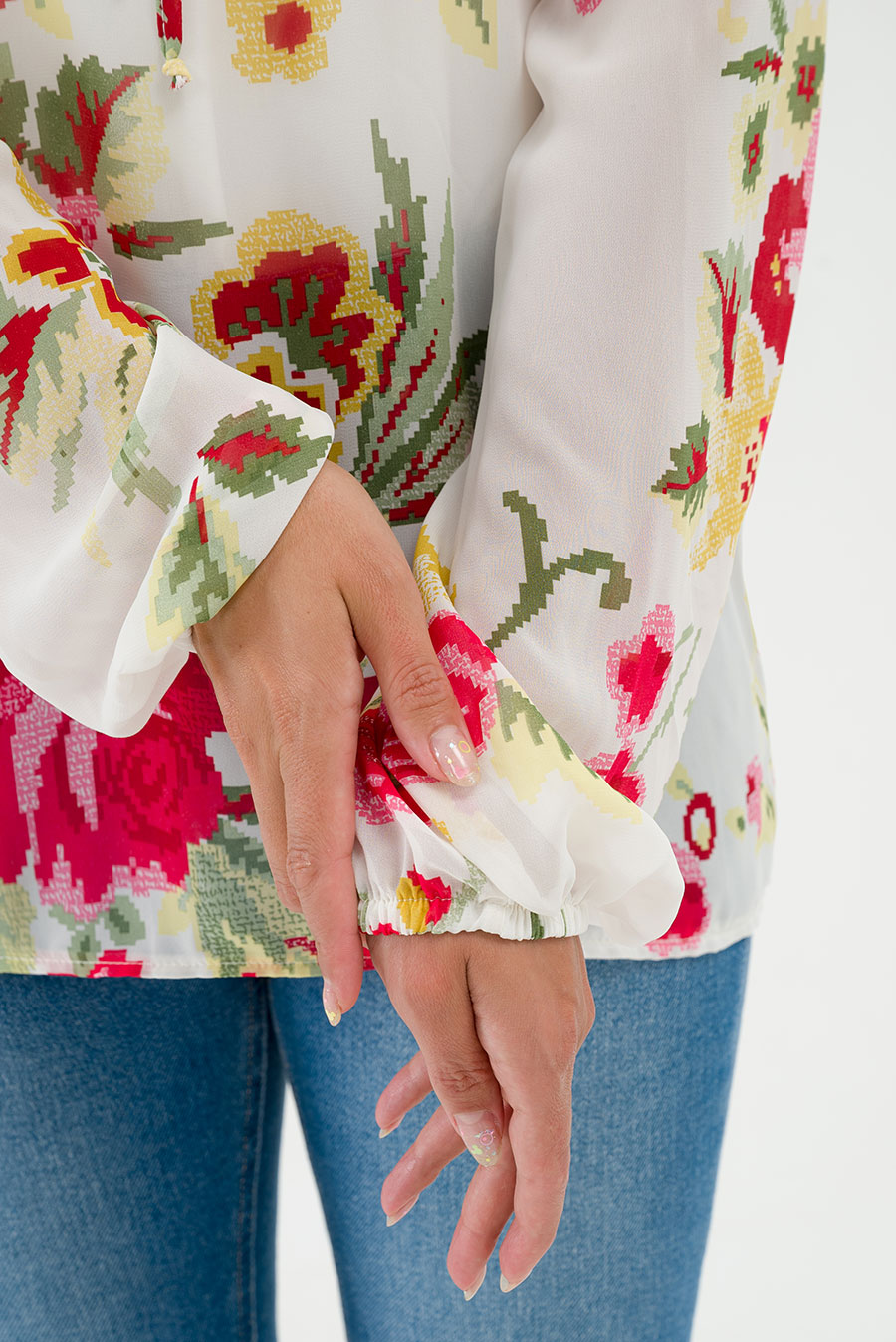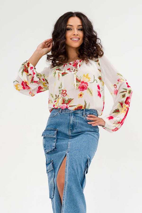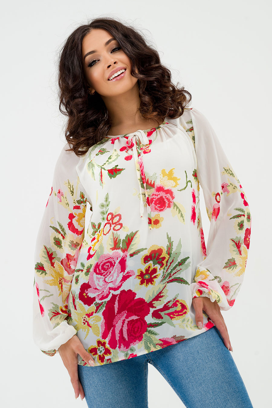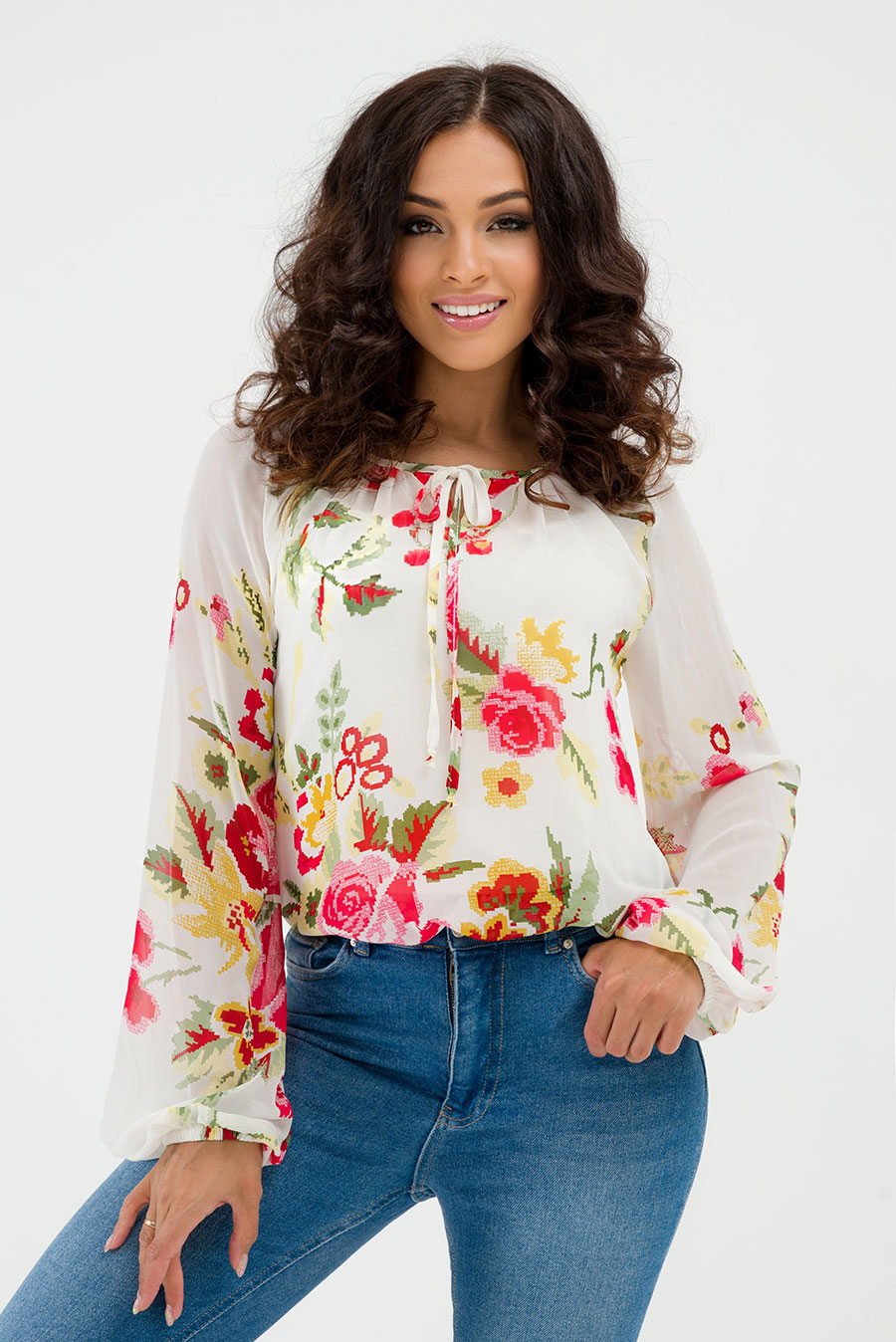 Модная блуза в стиле «бохо», выполнена из шифона. Модель с соблазнительными завязками на груди и модными рукавами на резинках.